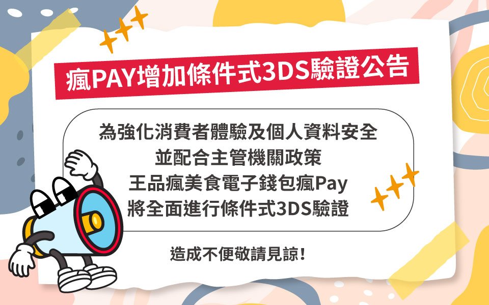 2024-10-23~2025-05-31為強化消費者體驗及個人資料安全,配合主管機關政策,王品瘋美食電子錢包瘋PAY將於 2024.10.23 起全面新增條件式3DS驗證。